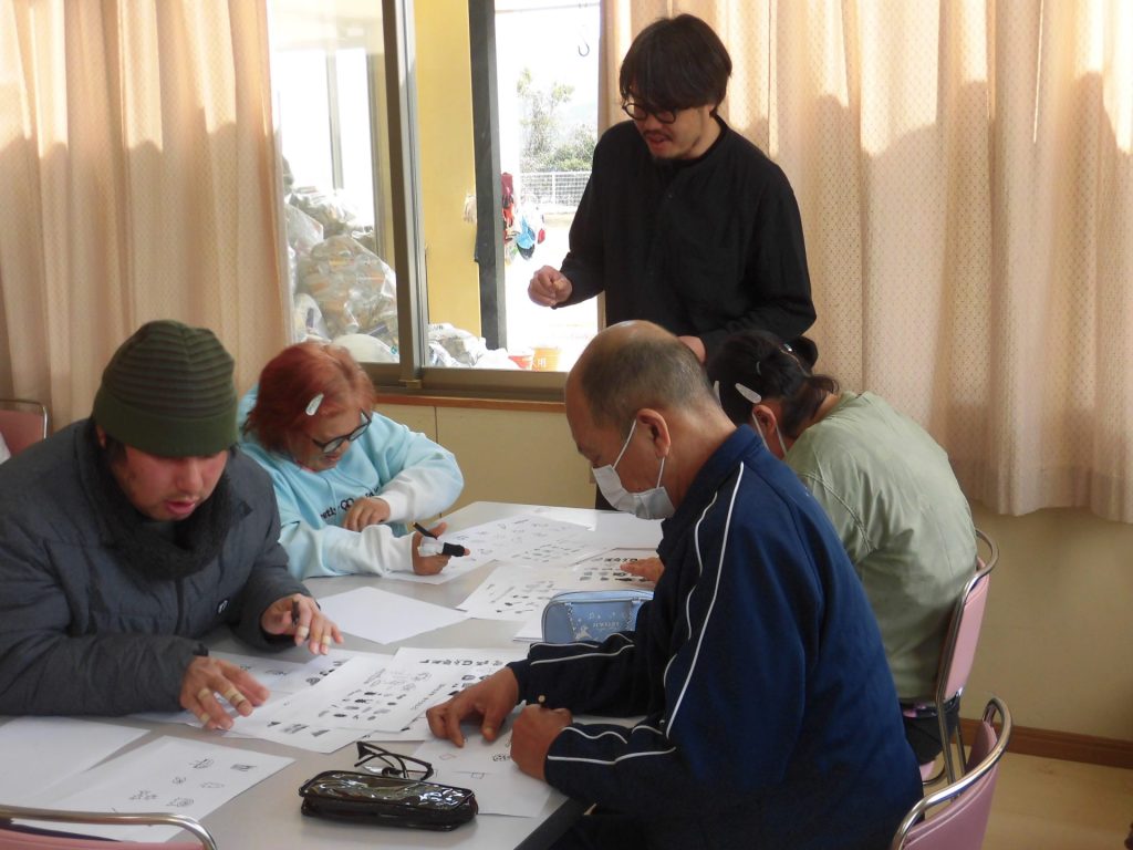 場所は悠々工房の食堂。初めての取り組みに緊張気味の利用者の皆さん。