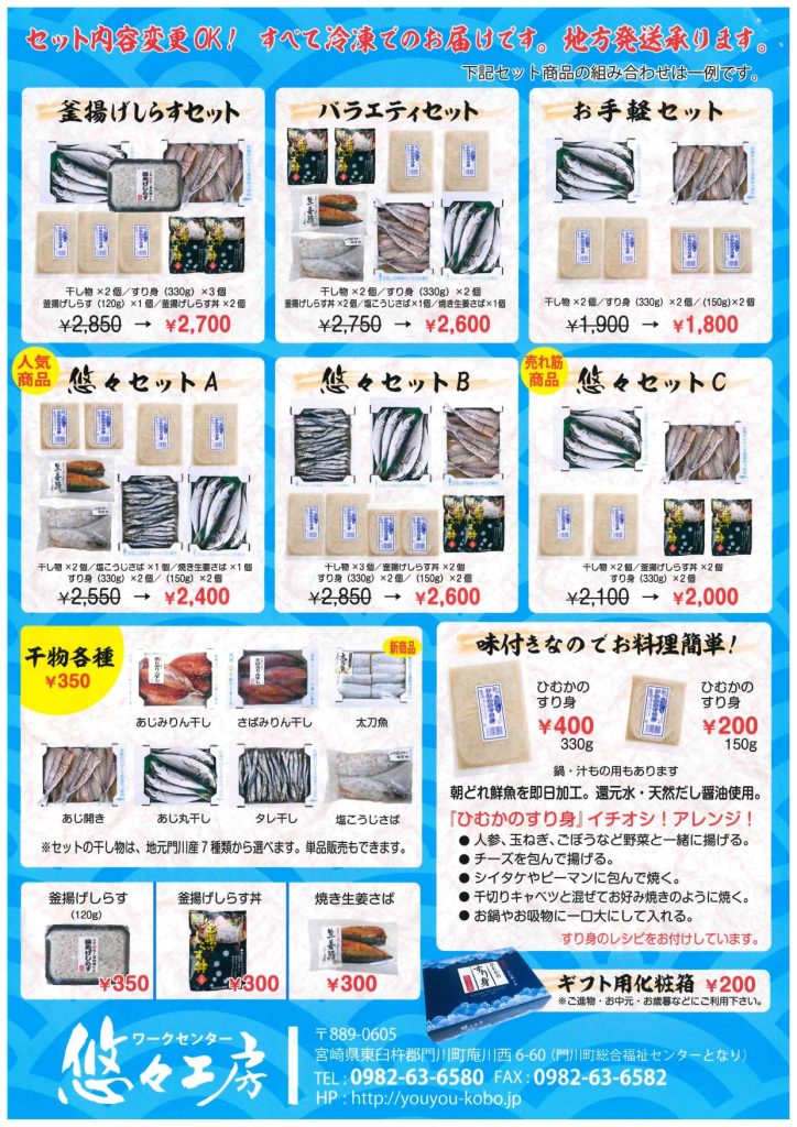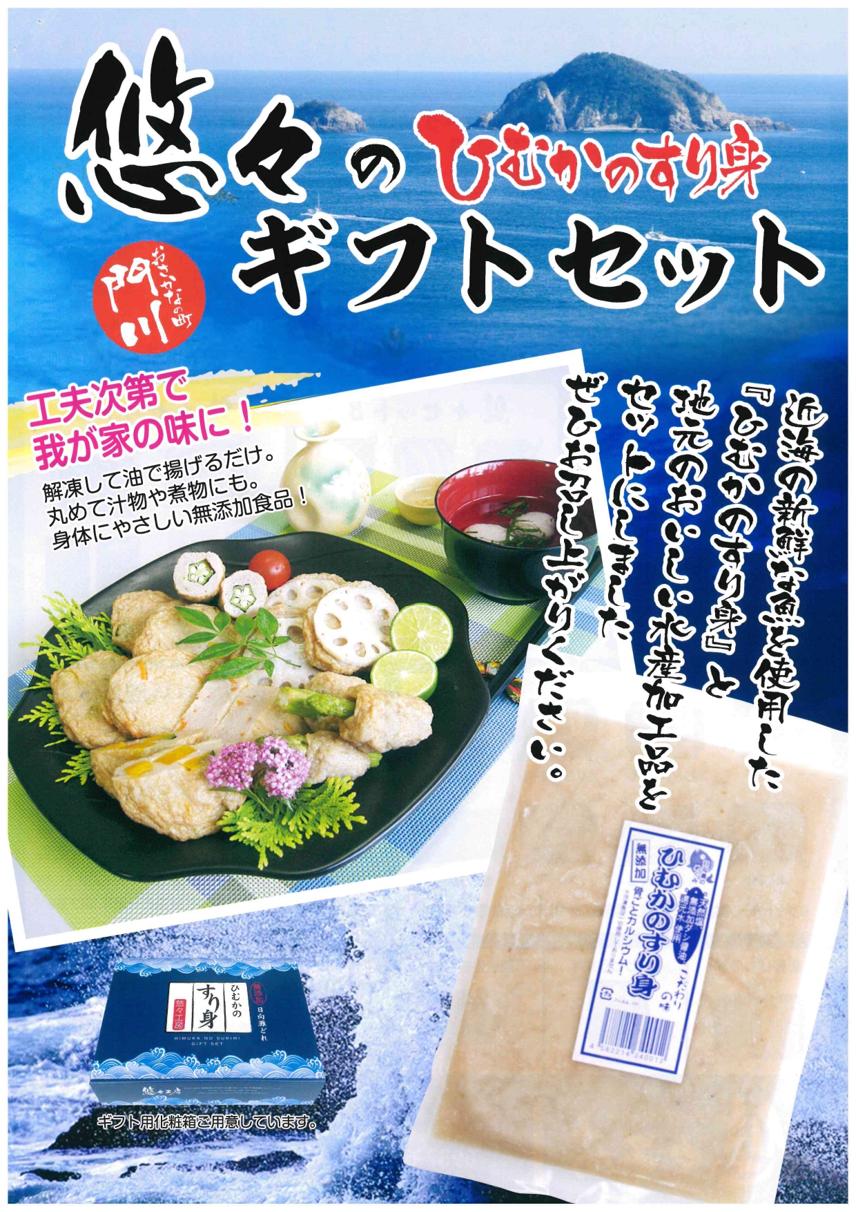 近海の新鮮な魚を使用した「ひむかのすり身」と地元のおいしい水産加工品(干物)をセットにしました!