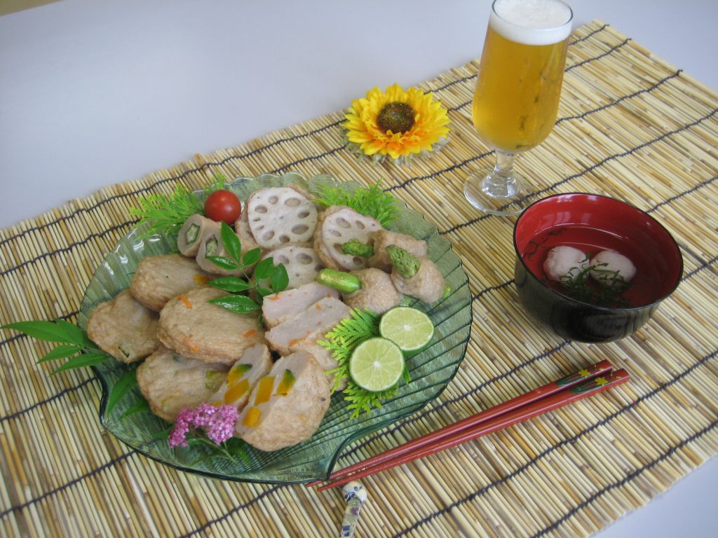 オクラやアスパラにすり身を巻き付けて揚げる、特にオクラは切り口が星形でかわいい仕上がりに!