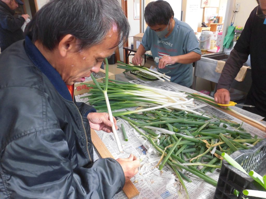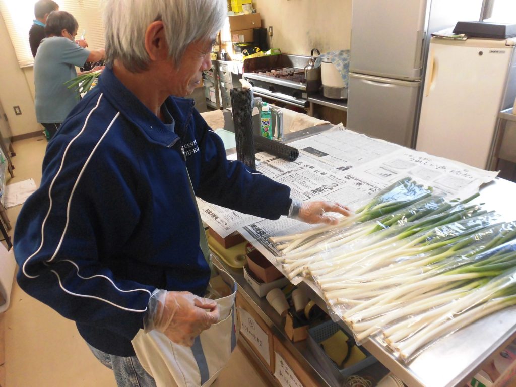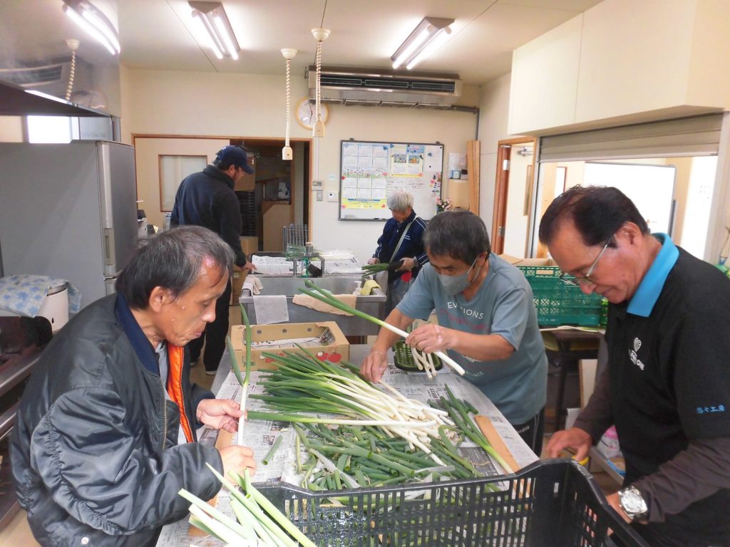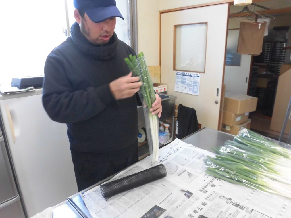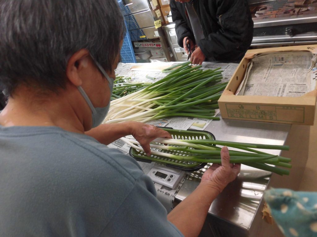野菜の計量や袋詰めを行っています。この日の野菜は美しい長ネギ!