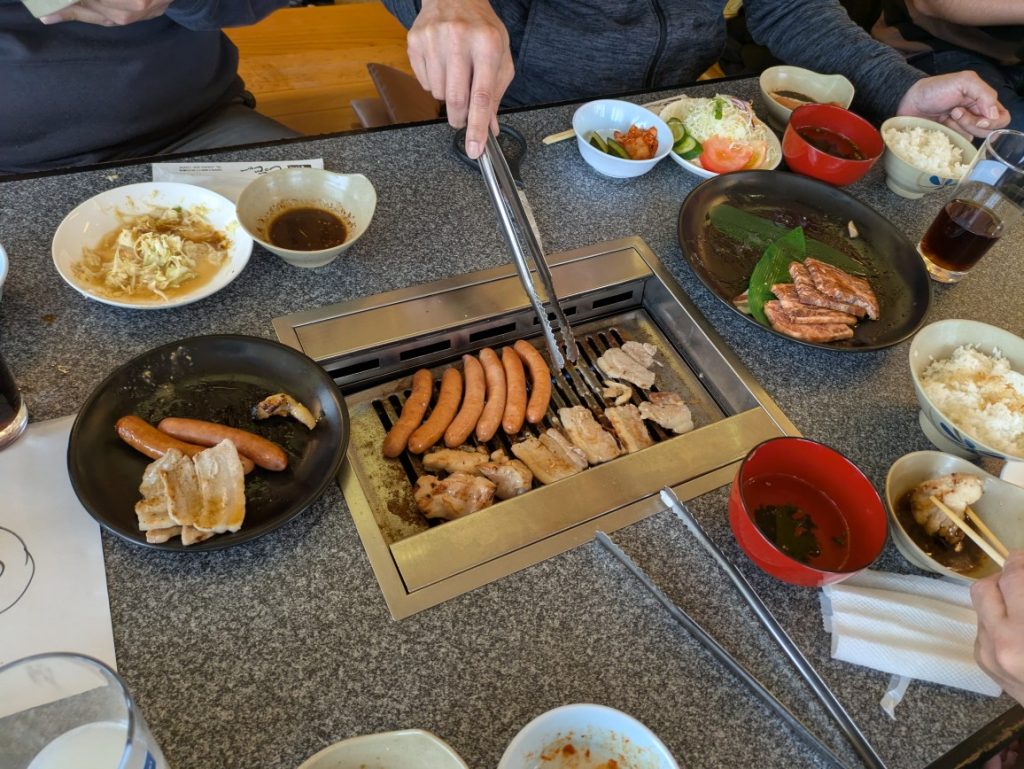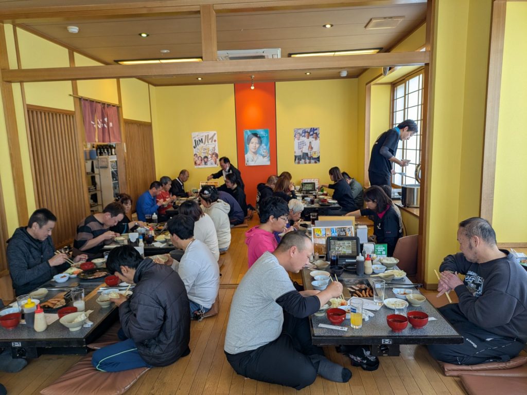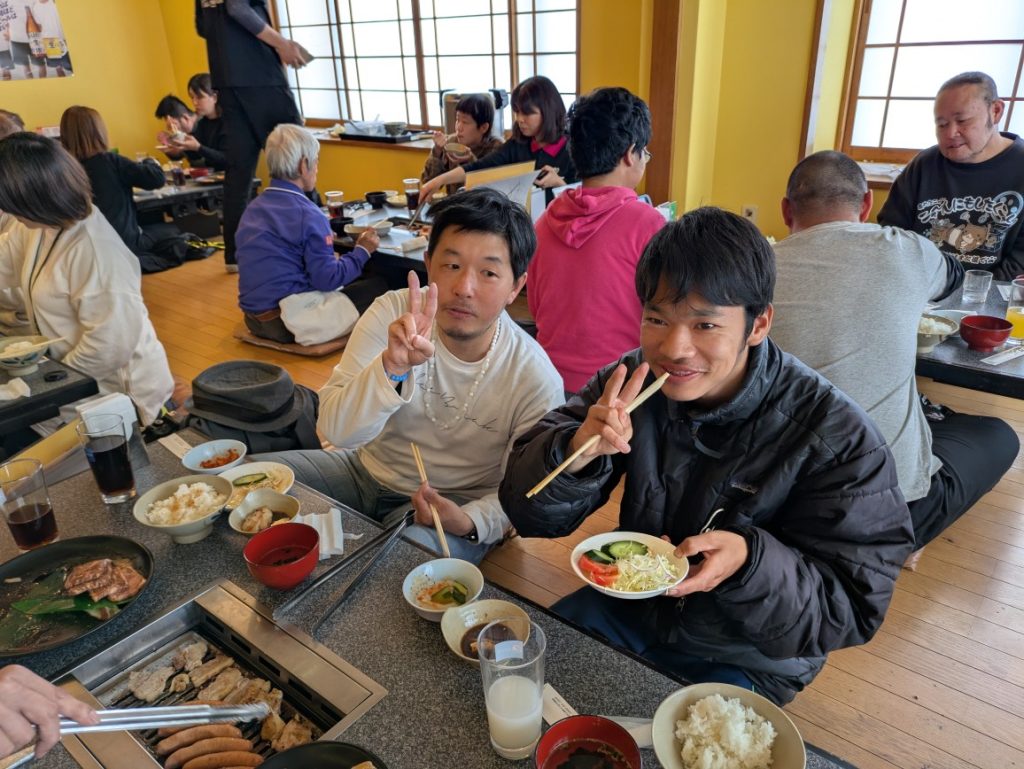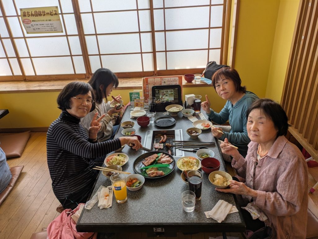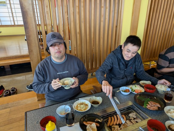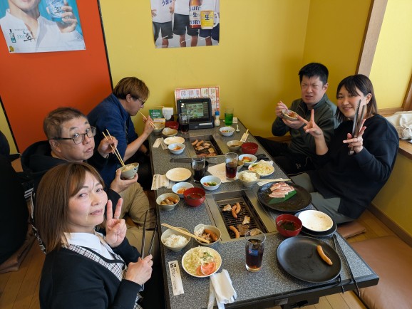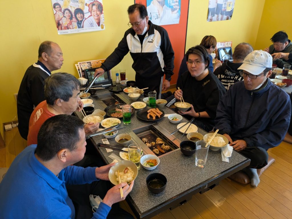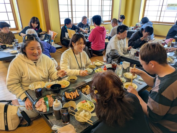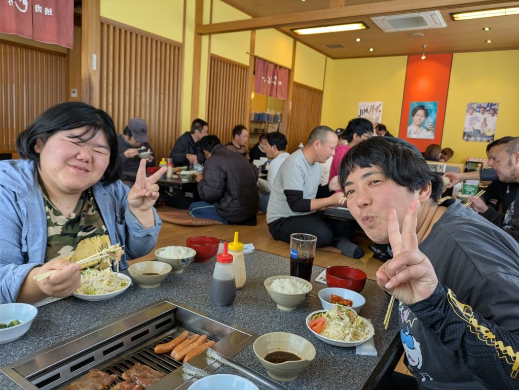 R7年3月29日(土)作業後に日向市の焼き肉じゅうじゅうに移動し、家族会の方に企画していただいた昼食交流会に参加しました。今回は年度末の最終行事。「令和6年度、1年間お疲れさまでした」ということで開催していただきました。皆さん『焼き肉』という響きにテンション爆上がり!!この日をすご~く楽しみに参加されていました。皆さんと一緒に食べることで、普段は野菜嫌いでもモリモリと野菜を食べられる方もありました(^^)/。自分たちで焼きながら食べる楽しさ、そして「ご飯おかわり自由!」このシステムもありがたく、中にはどんぶり4杯のご飯を完食された方も…(◎_◎;)