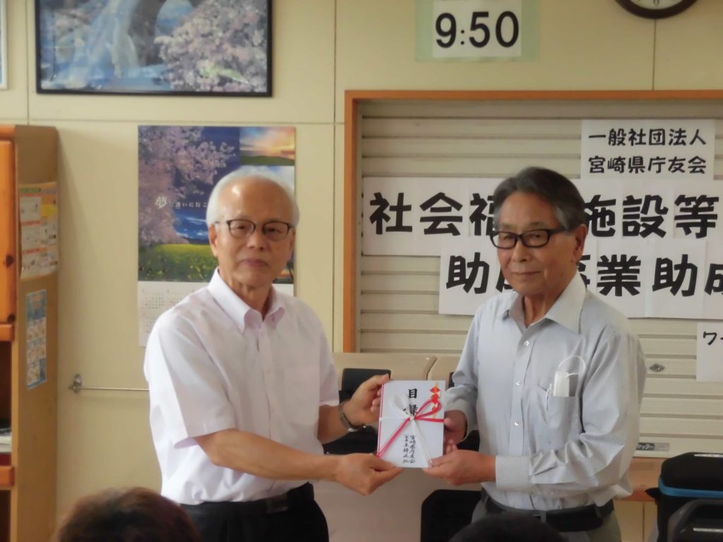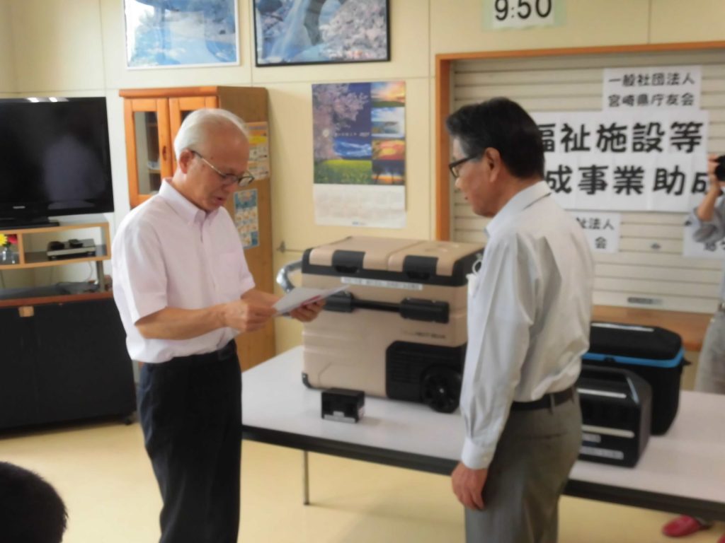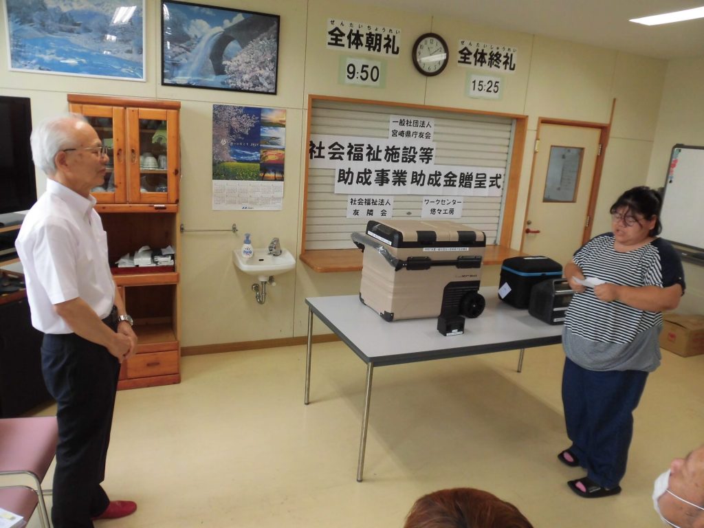 県庁退職者で組織する一般社団法人宮崎県庁友会様から、45ℓのポータブル(移動式)冷凍冷蔵庫と専用バッテリー等の購入のための助成金(139,590円)が贈られ、8月4日、悠々工房食堂にて贈呈式を行いました。土持会長様より吉田理事長に目録が手渡され、利用者代表が「大事に販売などで使っていきます」とお礼の言葉をお伝えしました。