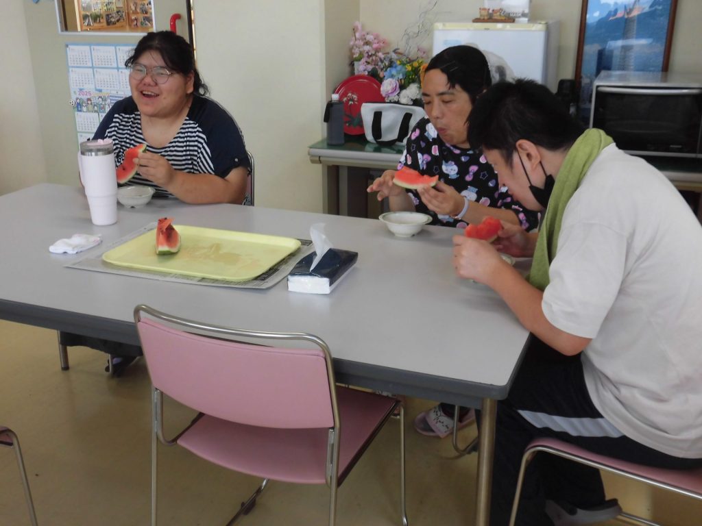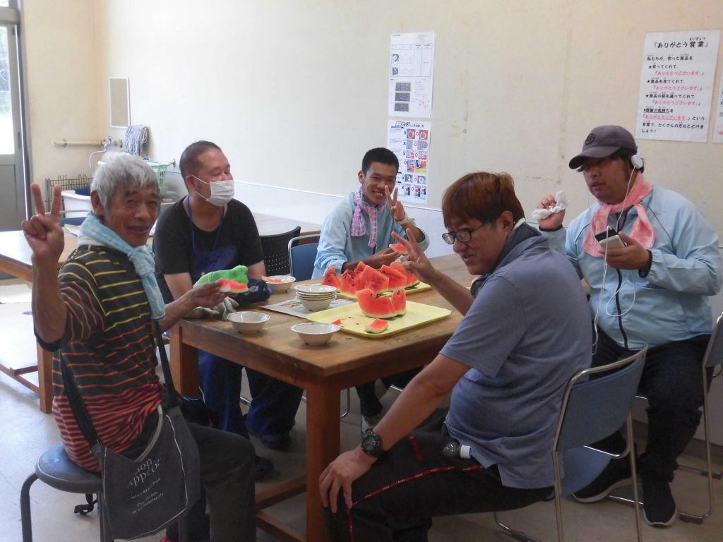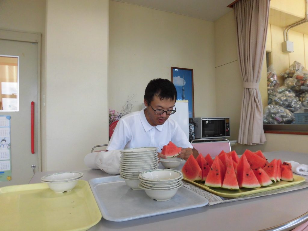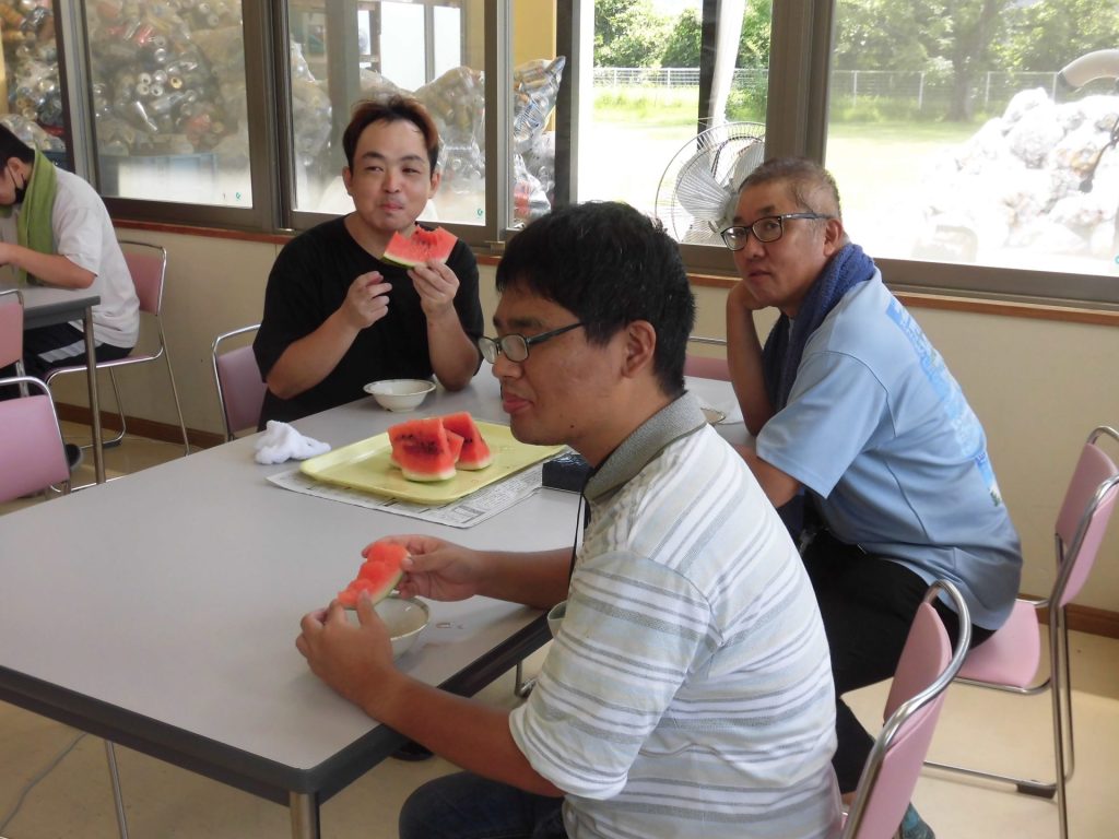 ご家族様より大きなスイカの差し入れが届きました。なんでも高鍋町までわざわざ買いに行ってくださったとか…ありがたや~ 今年は特にイヤになるような暑い日が続いています。外作業にがんばってヘロヘロになった後の、冷たくてあま~いスイカは最高でした!