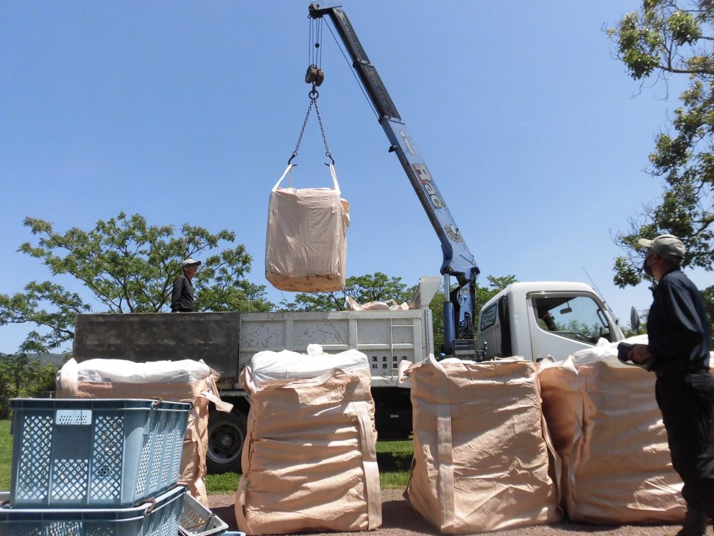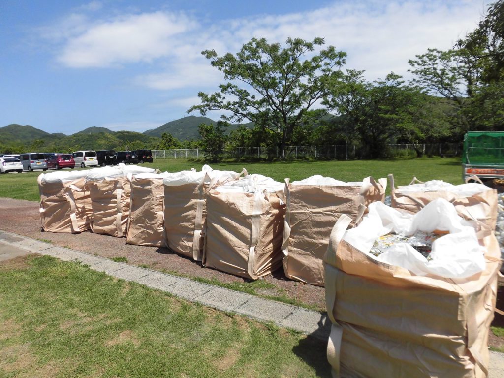 延岡市内の中禮商店様より、アルミ缶の引き取りに来ていただきました。この袋の中に、機械でプレスされたアルミ缶がぎっしり入っています。全部で1000キロ以上の量になっていると思います。