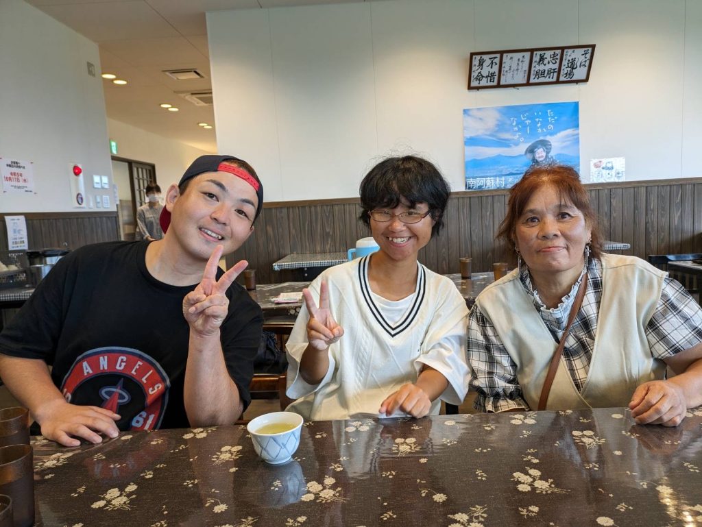 久木野でのそば打ち体験、阿蘇大橋の見学、真和館での研修、