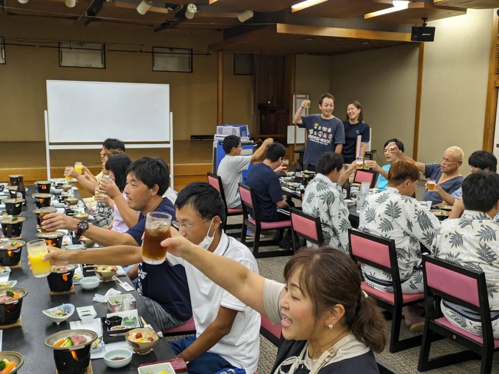 ホテルでのご馳走に乾杯!!ビンゴゲームやカラオケも盛り上がりました。