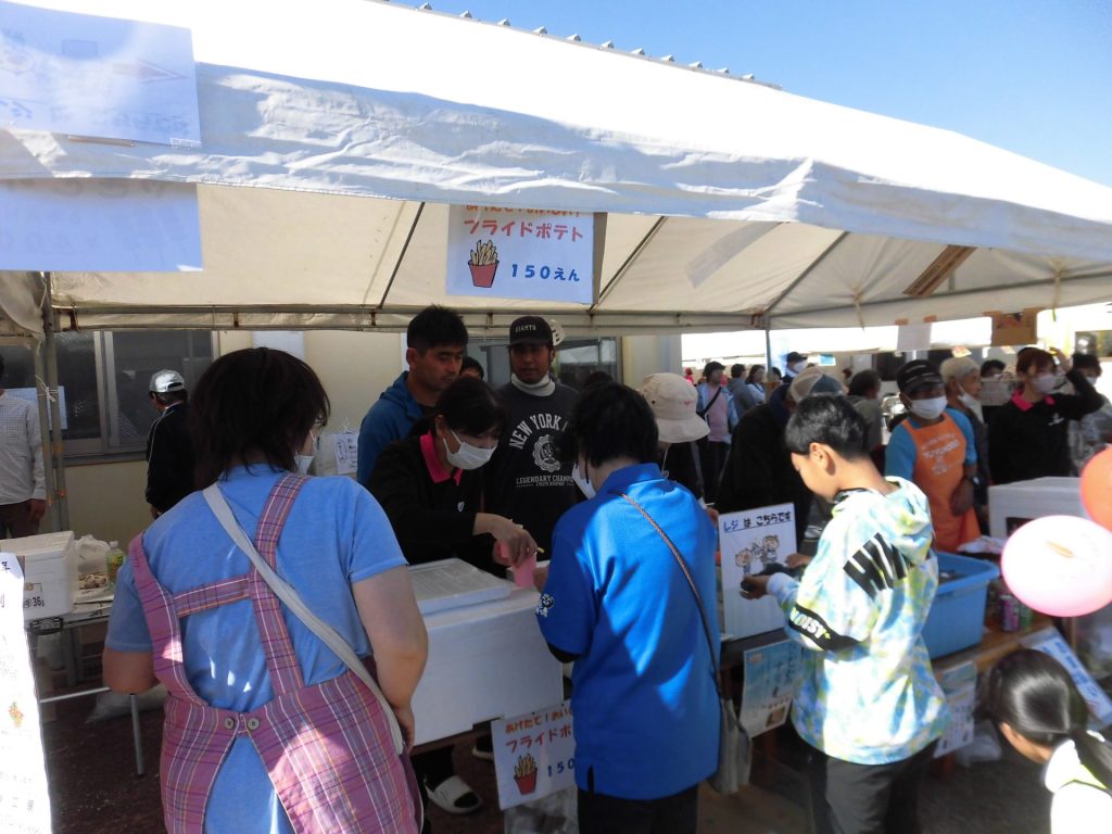 利用者の皆さんは、加工科、焼き鳥班、ポテト班、販売班など、各担当に分かれての活動となりました。